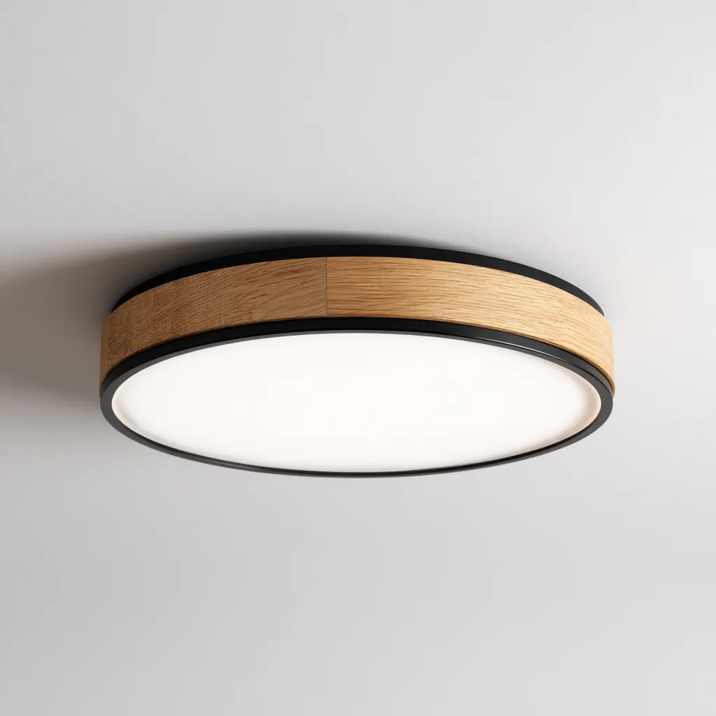 Esta lámpara de techo combina un aro de madera natural con una estructura metálica negra y una pantalla difusora amplia que ofrece una iluminación uniforme, ideal para salas, dormitorios y pasillos.