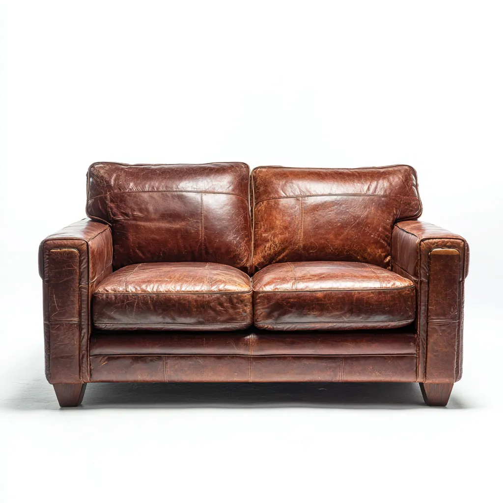 El sofá está tapizado en piel auténtica de color marrón, con una textura natural que envejece de forma atractiva. La estructura interna está fabricada con materiales sólidos para garantizar estabilidad y durabilidad.