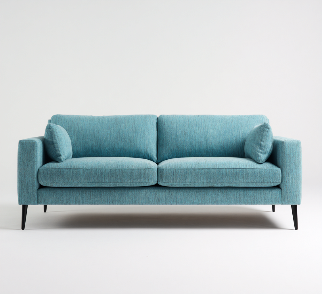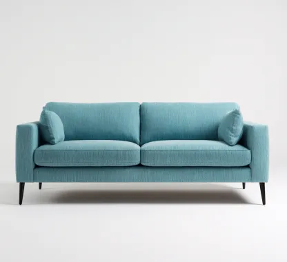 El sofá está tapizado en tela de color azul con una textura suave y resistente. La estructura interna utiliza materiales sólidos que proporcionan estabilidad y durabilidad en el uso diario.