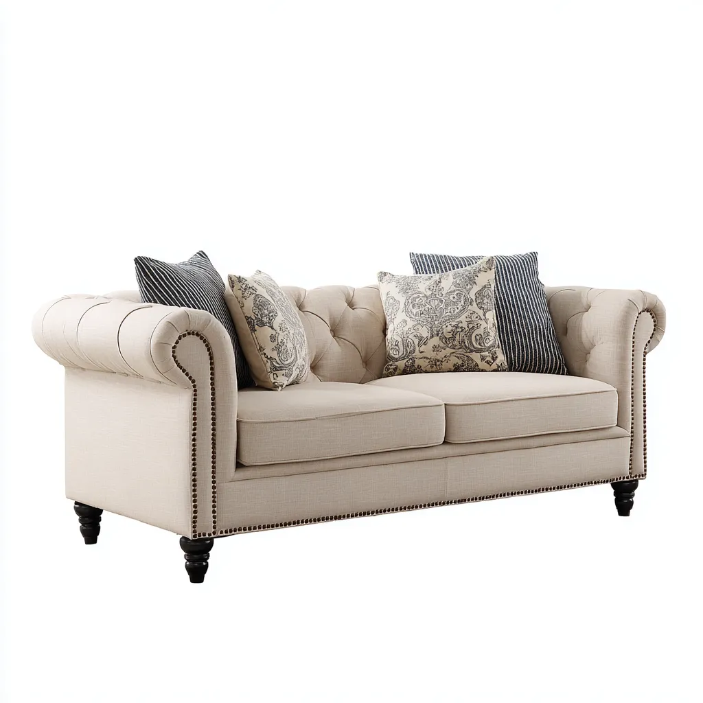 El sofá está tapizado en tela resistente de color beige con una textura suave y agradable. La estructura interna está fabricada con materiales sólidos que garantizan estabilidad y durabilidad. El respaldo capitoné y las tachuelas decorativas aportan un acabado artesanal distintivo.