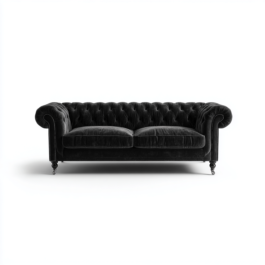 El sofá está tapizado en terciopelo de color negro con una textura suave y elegante. La estructura interna utiliza materiales sólidos que garantizan estabilidad y durabilidad. El respaldo capitoné y los detalles decorativos ofrecen un acabado artesanal refinado.