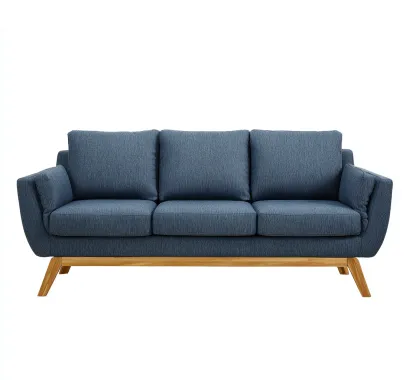 Tapizado en tela de color azul, combinado con una base y patas de madera que aportan estabilidad y un acabado natural. El tejido es suave al tacto y adecuado para el uso diario.