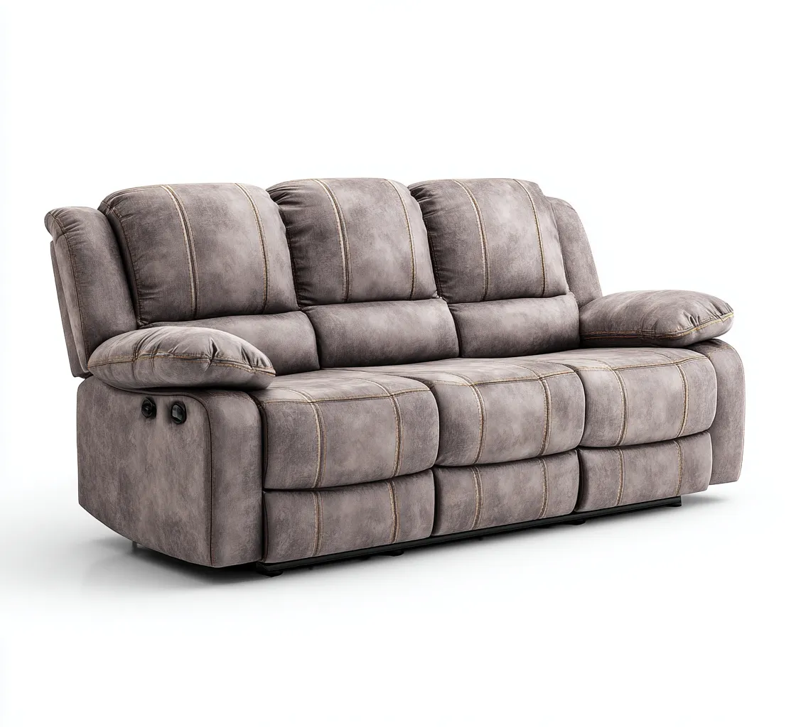 Este sofá de 3 plazas incorpora un diseño reclinable moderno pensado para ofrecer un alto nivel de confort en la sala de estar. Su estilo robusto y acolchado crea un ambiente acogedor y adecuado para el descanso diario.