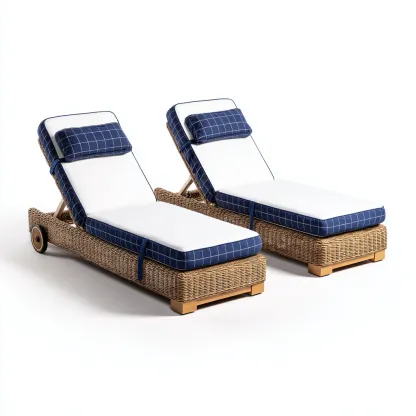 La estructura de ratán sintético trenzado proporciona resistencia a la intemperie y estabilidad. Los cojines blancos con bordes en azul ofrecen una superficie cómoda para descansar y están fabricados con tejido resistente apto para uso exterior.